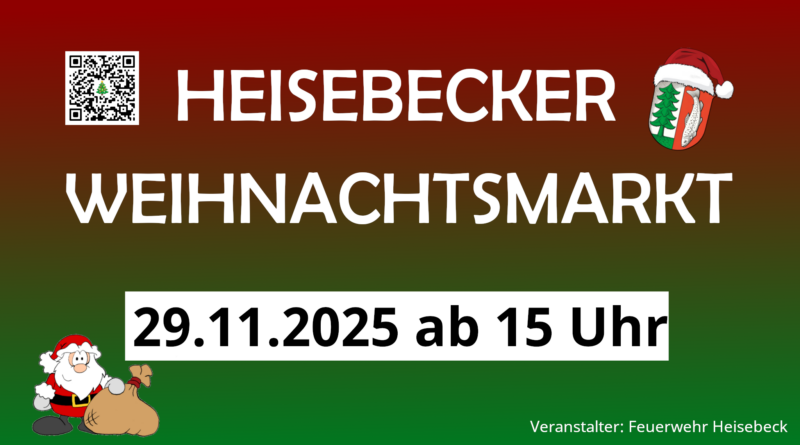 Die Feuerwehr Heisebeck lädt herzlich zum 34. Weihnachtsmarkt ein!Am Samstag, den 29. November 2025, verwandelt sich der Platz vor dem