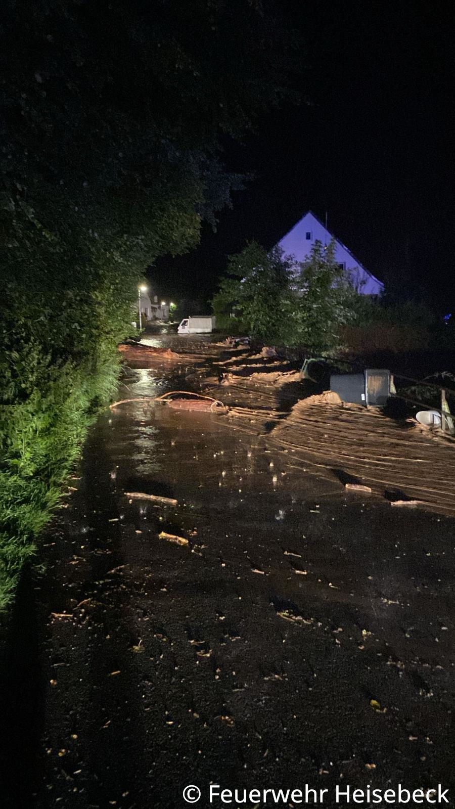 Im Laufe des Tages arbeiteten wir an zahlreichen Einsatzstellen in der Ortslage Gieselwerder mit und unterstützten bei den Aufräumarbeiten. Die Feuerwehr Heisebeck war am Freitag bis um 19:14 Uhr vor Ort im Einsatz; einschließlich der Nacharbeiten, der Reinigung des Fahrzeugs sowie der Pflege und Säuberung der Geräte waren wir insgesamt ca. 21 Stunden im Großeinsatz beschäftigt. Während des Einsatzes wurden mehrfach die Kameraden ausgewechselt, da die Arbeit in Gieselwerder sehr kräftezehrend war. Dazu wurde unser MTF genutzt, welches während des Einsatzes parallel im Zeltlager der Jugendfeuerwehr in Oedelsheim gebunden war und den Transport der Kameraden aus Heisebeck übernommen hat. Mit uns im Einsatz waren die gesamten Feuerwehren aus Wesertal, das DRK Wesertal, zahlreiche Katastrophenschutz-Züge aus dem Kreis Kassel und darüber hinaus sowie das THW und ein Hubschrauber von der Polizeibereitschaft.