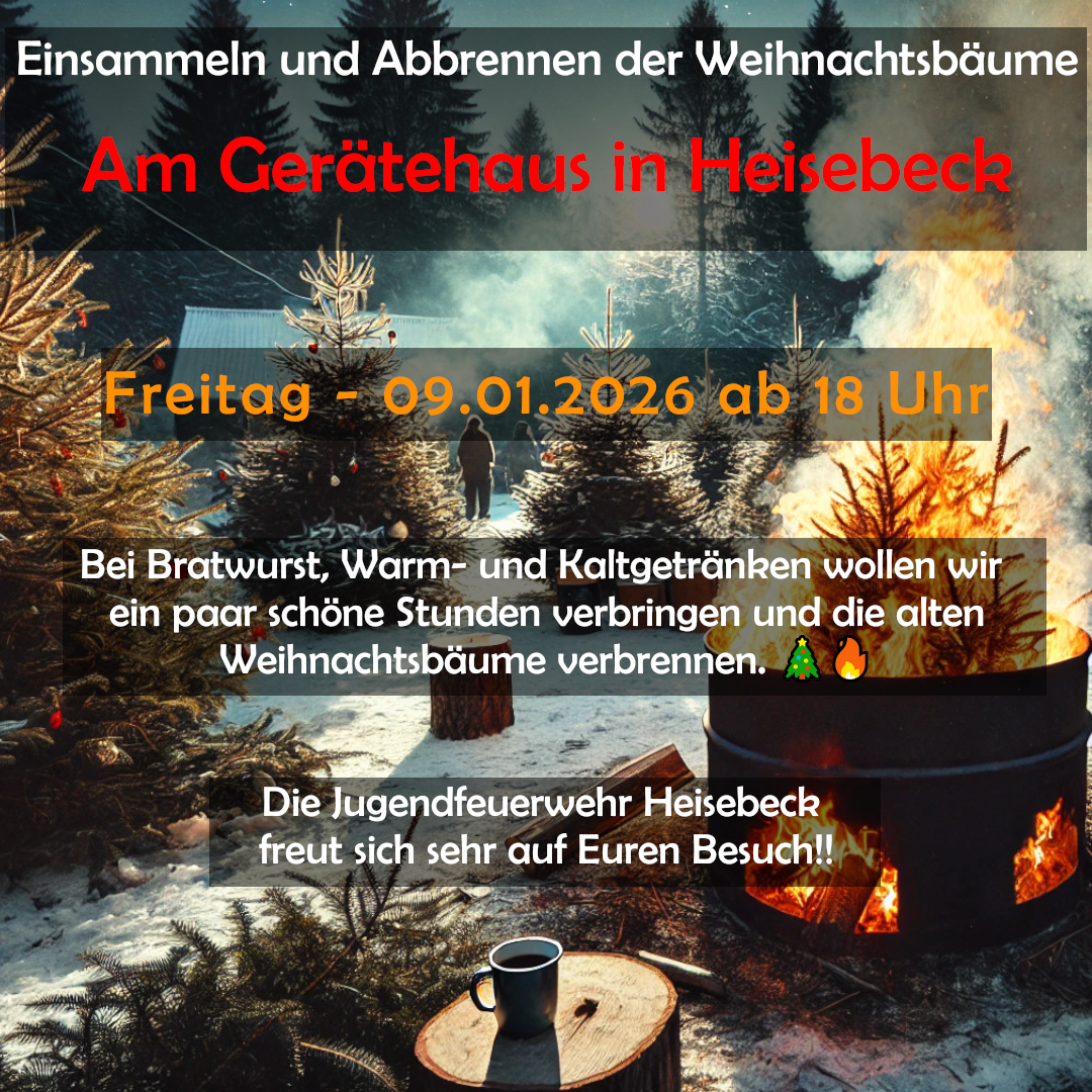 Die ausgedienten Weihnachtsbäume werden im neuen Jahr 2026 am Freitag, den 09.01.2026, in Heisebeck ab ca. 15:00 Uhr eingesammelt. Bitte stellen Sie die Bäume gut sichtbar an der Straße bereit. Die Jugendfeuerwehr Heisebeck sammelt die Tannenbäume im Dorf mit Unterstützung der Einsatzabteilung ein. Über eine kleine Spende, die der Jugendarbeit der Feuerwehr Heisebeck zugutekommt, freut sich die Jugendfeuerwehr sehr.
